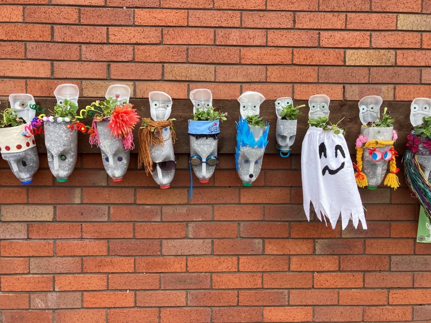 In addition, the onsite team worked alongside County Care, a charity teaching independent living skills to young adults with learning difficulties. The young adults collected empty plastic milk bottles and turned them into colourful character heads, before filling with compost and plants to resemble hair. The result was around 40 wall-mounted bright heads sprouting wildflower hair.